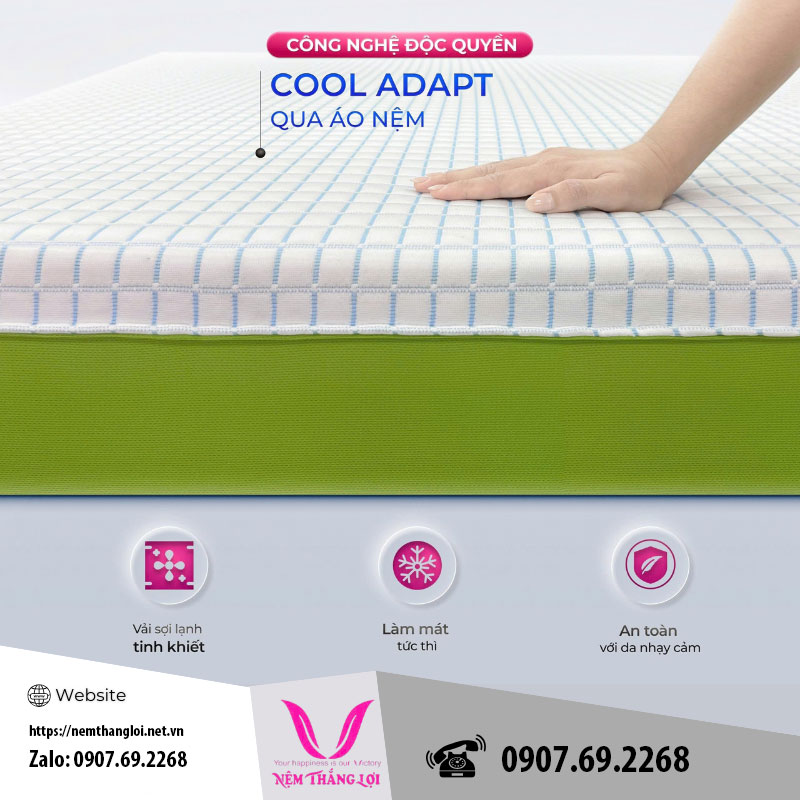 Chất liệu vải bề mặt là yếu tố đầu tiên tạo cảm giác dễ chịu cho người dùng. Khác với các loại vải thông thường, Spandex cao cấp kết hợp công nghệ Cool Adapt mang lại cảm giác mát lạnh tức thì, không gây cảm giác nóng rát hay ẩm ướt khi tiếp xúc. Lớp vải này còn có đặc điểm co giãn linh hoạt, giúp ôm sát mặt nệm và cơ thể, từ đó tối ưu phản hồi về nhiệt độ và hỗ trợ trải nghiệm thư giãn tuyệt đối.