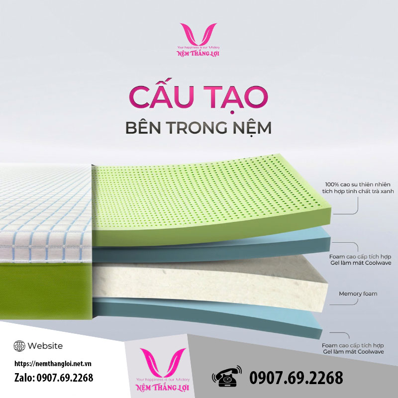 Sự thành công của một chiếc nệm cao cấp không chỉ dựa vào thiết kế vẻ ngoài mà còn thể hiện qua cấu trúc bên trong, nơi hội tụ những công nghệ tiên tiến nhất cùng nguyên liệu tự nhiên. Đối với nệm điều hòa hybrid matcha cool Thắng Lợi, các lớp cấu thành được nghiên cứu kỹ lưỡng, tối ưu hóa để đạt độ bền cao, khả năng làm mát và tính năng nâng đỡ chuẩn xác.